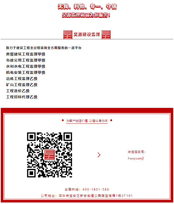 深圳市昊源工程监理是一家专业的监理服务公司,有着很丰富的经验和贴心的保姆式服务,专门为雇主保驾护航,欢迎全国的小伙伴来电咨询0755-27847460