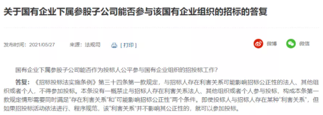 一、关于国有企业下属参股子公司能否参与该国有企业组织的招标的答复