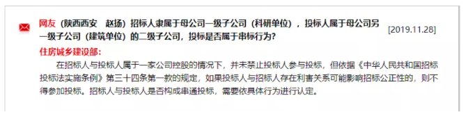 答复:在招标人与投标人属于一家公司控股的情况下,并未禁止投标人参与投标,但依据《中华人民共和国招标投标法实施条例》第三十四条第一款的规定,如果投标人与招标人存在利害关系可能影响招标公正性的,则不得参加投标。招标人与投标人是否构成串通投标,需要依具体行为进行认定。(答复单位:住建部)