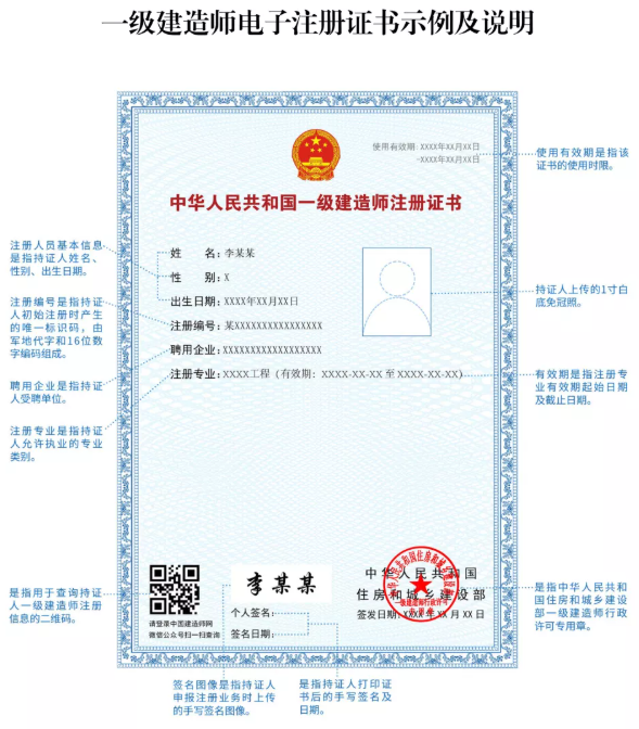 (具体示例及说明见附件1),电子证书式样按照《全国一体化在线政务服务平台电子证照一级建造师注 册证书》标准执行(具体式样见附件2)。自 2022年1月1日起,一级建造师统一使用电子证书,纸质注册证书作废。