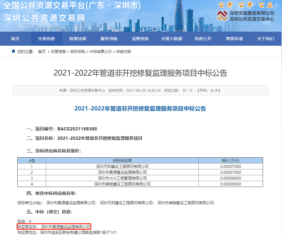 2021年4月,深圳市宝安排水有限公司委托第三方,对其“2021-2022年管道非开挖修复监理服务项目(招标编号:BACG2021168388)”进行招标,经专家评委、用户方代表和招标机构评审,确认昊源监理中标2021-2022年管道非开挖修复监理服务项目。